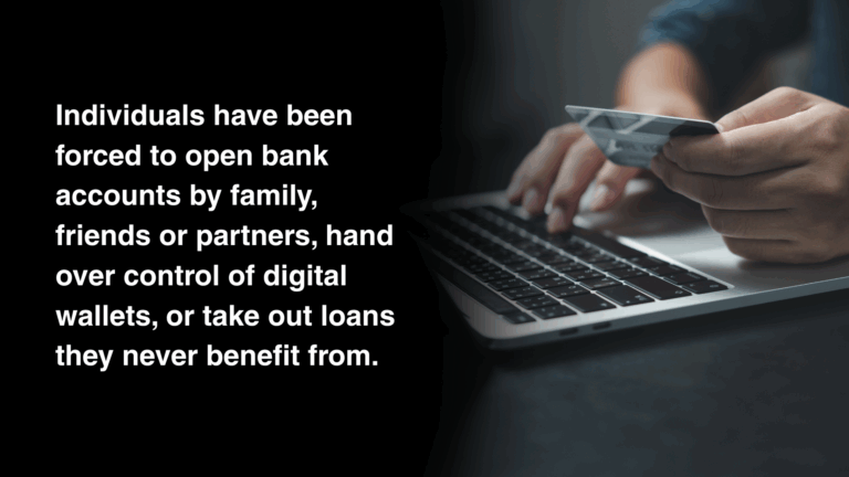 - Loan fraud: Individuals are forced to take out credit or loans in their name, often under threat or manipulation.