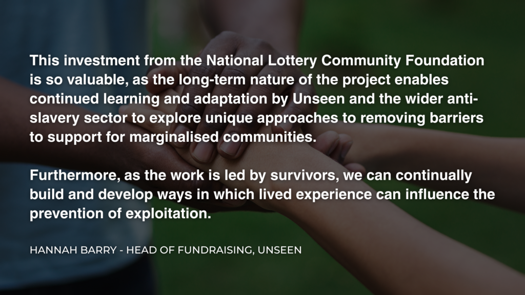 A central aspect of this project is the involvement of Unseen’s survivor consultant group. The project is regularly working with, training, and empowering survivors of modern slavery to act as key advisers, contributing to research and co-designing culturally sensitive, accessible materials available in multiple languages.
