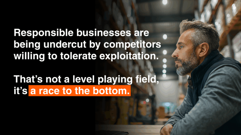 The UK currently imports approximately £20 billion worth of goods annually that carry significant risk of forced labour in their production. Without enforceable standards, responsible UK businesses are systematically undercut by competitors willing to tolerate – or wilfully ignore – exploitation in their supply chains. This is not a level playing field. It is a race to the bottom that penalises ethical conduct and rewards opacity.